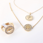 Conjunto Arbol Redondo Cristales en Acero Inoxidable, collar/gargantilla, Pulsera, y Anillo con forma de arbol rodeado de cristales. Para mujer, a usar en fiestas, compromiso, y bodas.